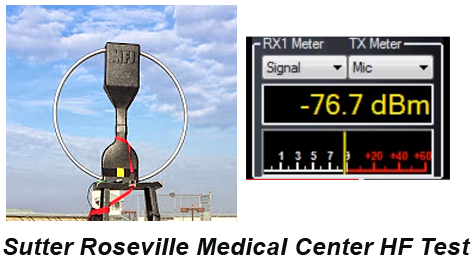 On Saturday, 10 Jan 2015, at 10:00 am (1800 UTC) Placer County ARES conducted an HF communications test net on the 40 meter band (frequency 7214 kHz LSB) from Sutter Roseville Medical Center (SRMC) in Roseville, CA. The total time of the test was a little over one hour. The equipment used included an Alinco DX-SR8 transceiver and an MFJ-1788 “Magnetic Loop” antenna that was being tested. 22 radio operators checked in and exchanged signal reports from northern and southern California and Nevada. A preliminary test had been done on Tuesday, 6 Jan 2015, at 10:00 am. Notice of the larger regional test on Saturday was given via VHS radio, packet radio, email and telephone.